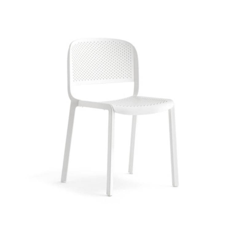 Delicate details of the injected polypropylene remember the joints of the solid wood defining a seating with and without armrests. Perforated shell and seat recall the industrial metal plates